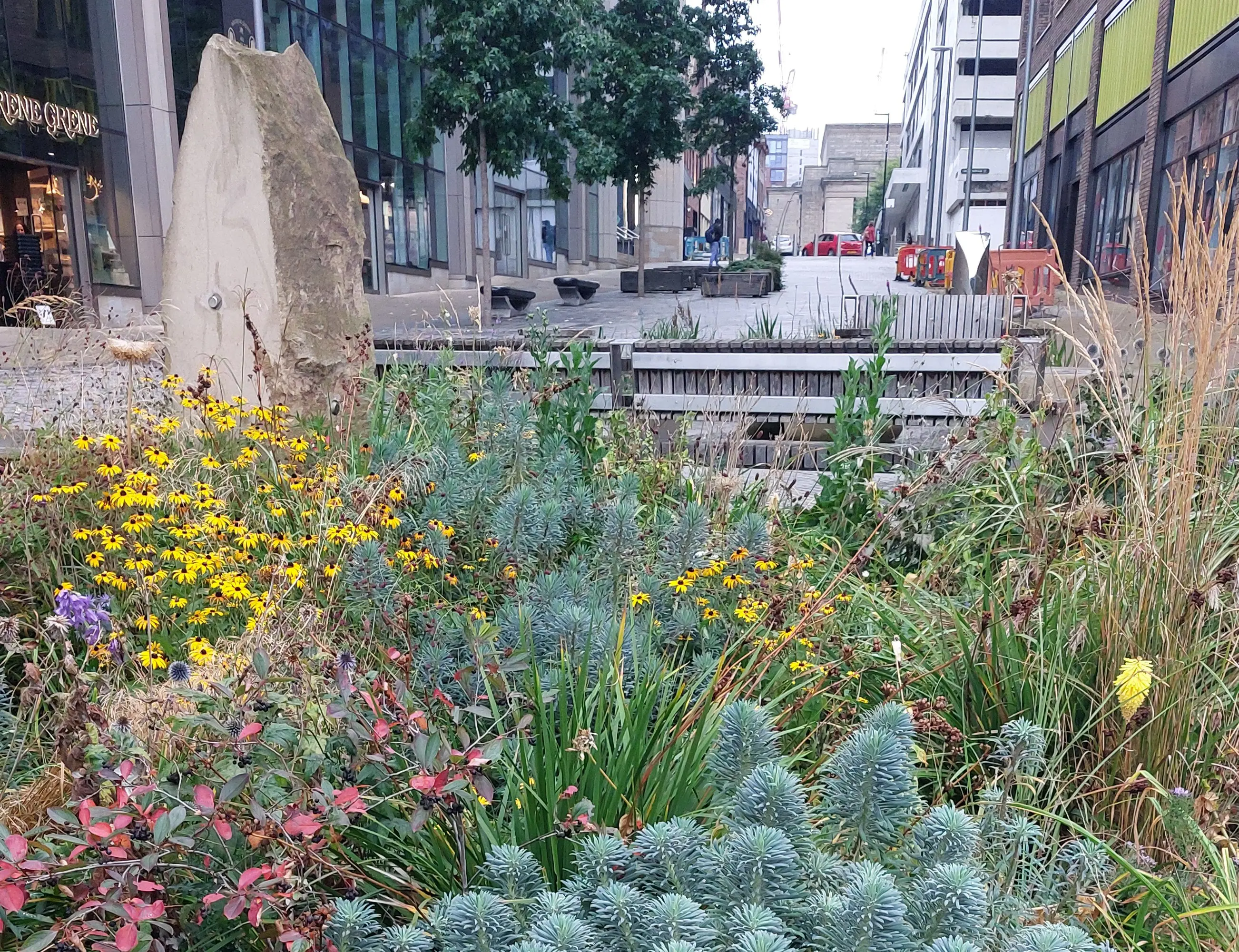 SuDS, or Sustainable Drainage Schemes, can include raingardens, adapted water butts, wetlands, and other innovative solutions that capture water and release it slowly back into the environment – rather than allowing it to race into drains and sewers from hard impermeable surfaces.